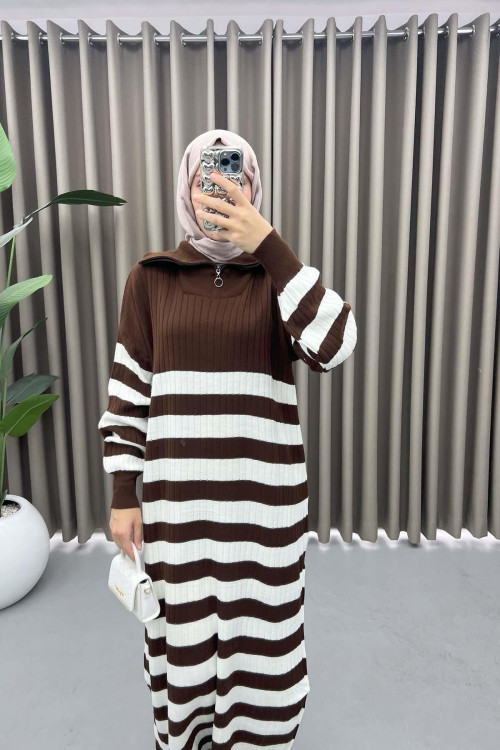 Collar Zippered Striped Dress Brown-1